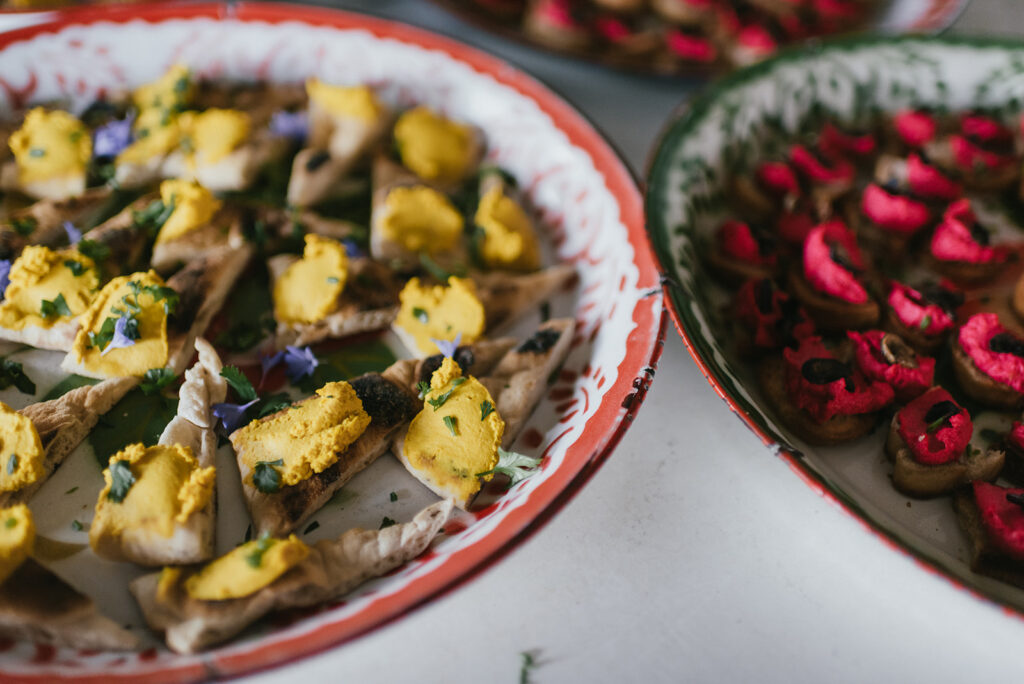 Alongside the welcome drinks, guests enjoyed Bright Beet Houmous with Garlic Mushroom on Crostini, Roast Garlic and Turmeric Dip with Handmade (by Amber) Flatbreads, Aloo Chaat Sticks with Zingy Green Coriander Chutney and Mango Chilli & Lime Tartlets.