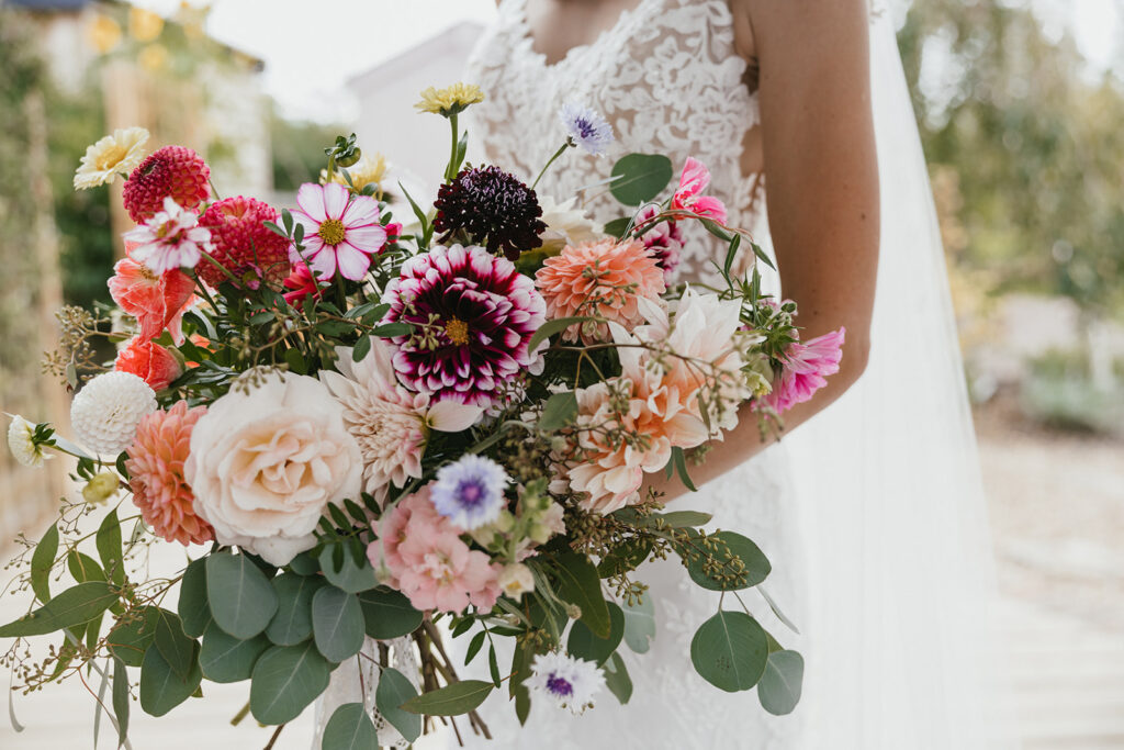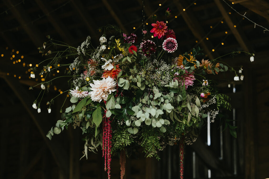 After some flower chat, Ginny & David loved the idea of our locally grown flowers, and opted for the Best of the Field, but requested a sprig of lavender in each buttonhole in memory of David’s mum. They had beautiful bouquets, flower crowns, hair flowers for Ginny, floral chandeliers and flowers on the tables in our vintage stem vases and bottles. Ginny had some lace from her mum’s wedding dress to be used with her bouquet. Their lovely late summer blooms included; Dahlias (of course), wafty Cosmos, Cornflowers, some deliciously dark Scabious, creamy pale yellow Calendula and Zinnias. There was a single red Poppy left at the field that we snuck into Ginny’s bouquet on the day – to tie in with her (lovely!) Mum’s dress. Long tassels of Amaranthus dangled down from their Chandeliers.
