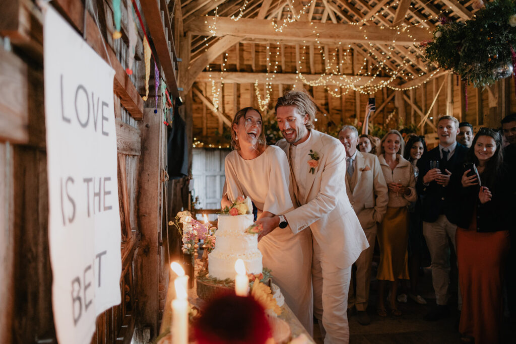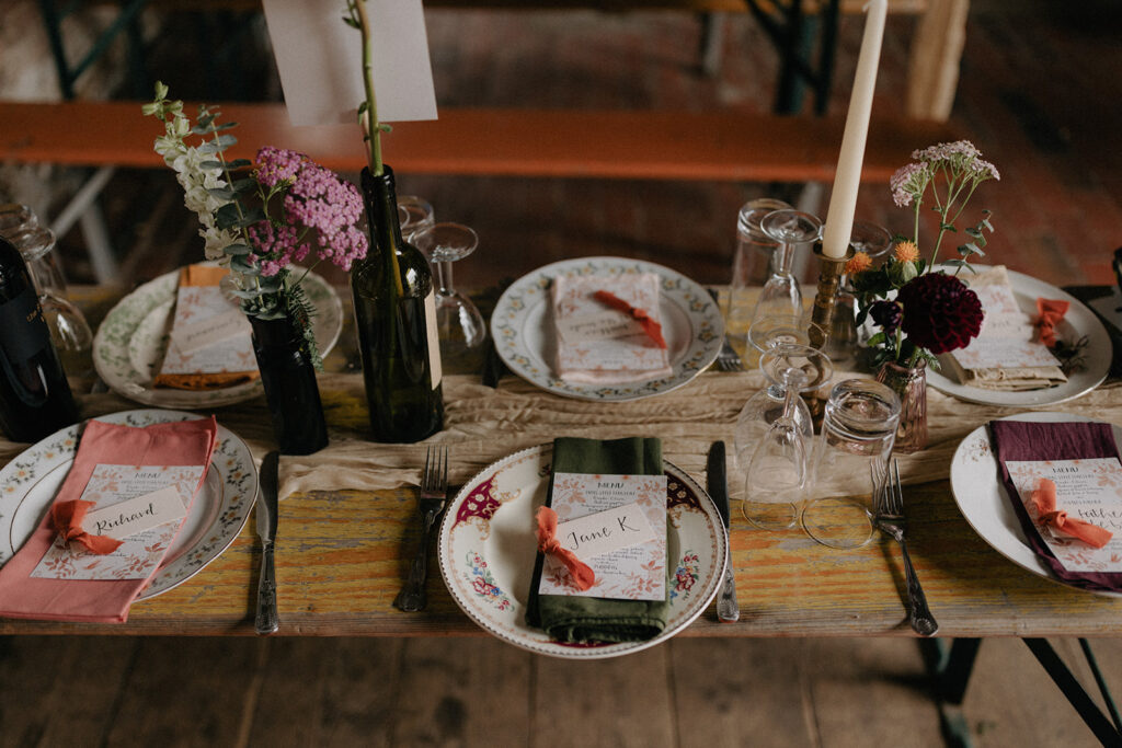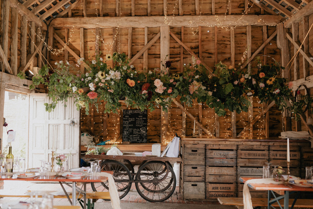 They both wanted simple decor that would let the setting and barn work it’s magic so we suggested using our vintage mismatched plates and hand dyed vintage napkins. They had Amber’s menus with a lovely rusty orange illustrated border sat on top of the plates and a friend made them place names. Rather than adding too much fuss – the tables look really beautiful before you’ve added anything else. Some lovely brass candlesticks from ‘The Toast’ thrown in for good measure and they were away with 3 DIY flower buckets (field grown!) and some willing volunteers setting up some table flowers. Sari bunting was strewn liberally about the place, and they had an Order of the day board, bar menu and an illustrated quote all on blackboards from Amber.