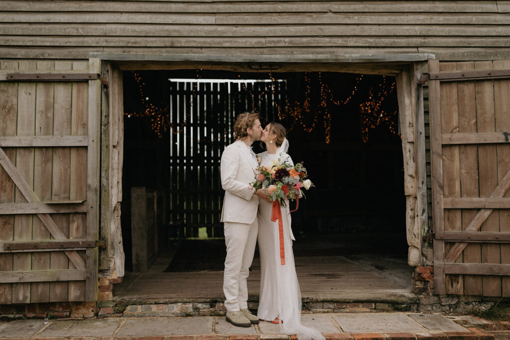 Vix and Sam asked for field grown flowers of warm tones of burnt orange, dusty pinks, reds and mustards. She wanted lots of seasonal wild foliage too. They had tons of bridesmaids and groomsmen all needing signs of office (8 bridesmaid bouquets, 9 buttonholes & a crown for a little flower girl!). For the barn they wanted a ladder for above the bar and 3 floral chandeliers. And DIY buckets for table flowers that they would do together with their friends.