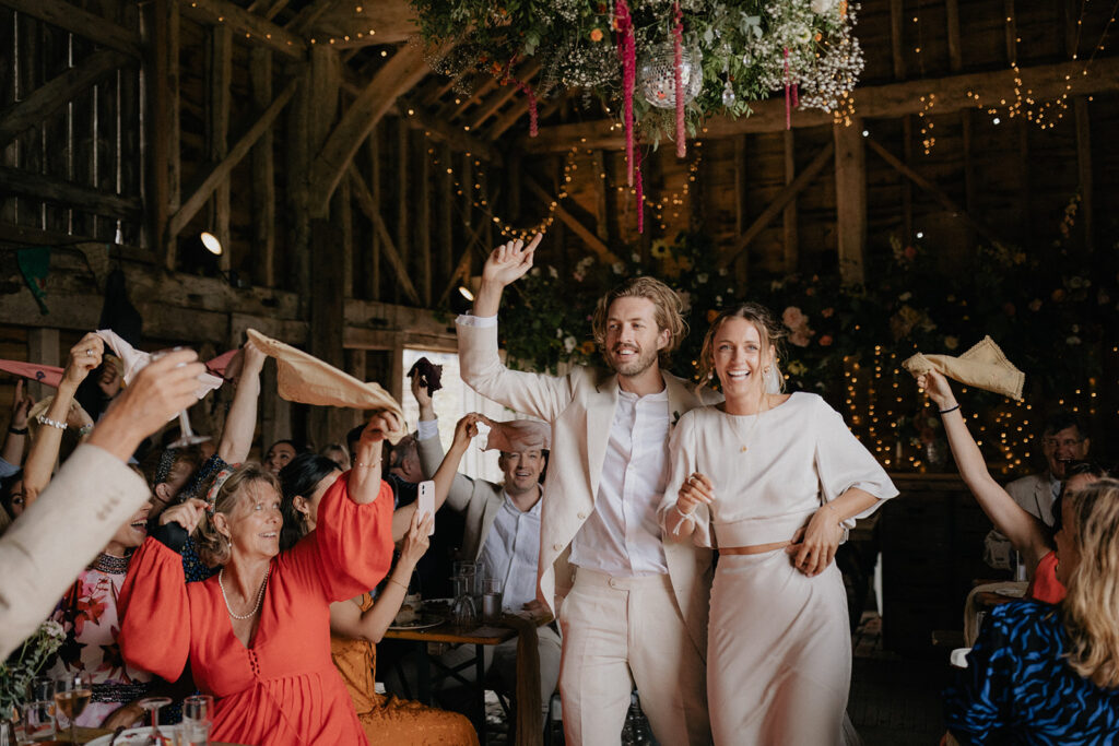 Vix and Sam entered barn to music and cheering and a sea of waving vintage napkins! They began dinner sat at their (festival named) tabled for sharing Tapas starters, Breads, Olives, Padron Peppers bedecked the tables alongside Baked Feta and Aubergines with Mint and Honey. Everyone tucking in and sharing them about.