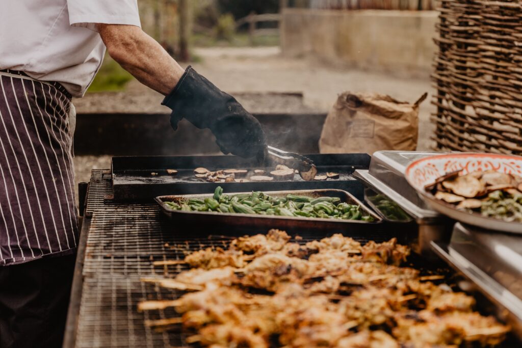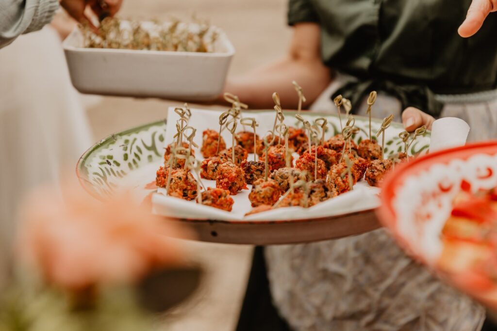 Ellie & Charlie picked a truly great menu, starting off their day with our Tapas Canapés. Featuring dishes of Patatas Bravas Skewers (cubed potatoes on skewers sat on spicy tomato sauce and covered in delicious spoonfuls of garlicky Crème Fraiche), Smoky Spanish Meatballs, Piquillo Pepper Crostini and Tomato & Butterbean Flatbreads (the smoky tomato butterbeans are another kitchen favourite, we have to make extra so that we all get some!).
