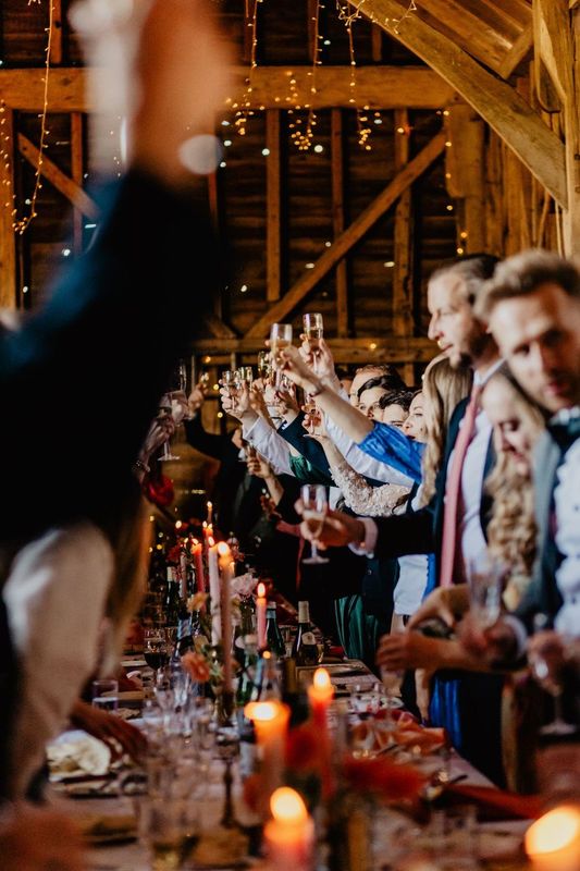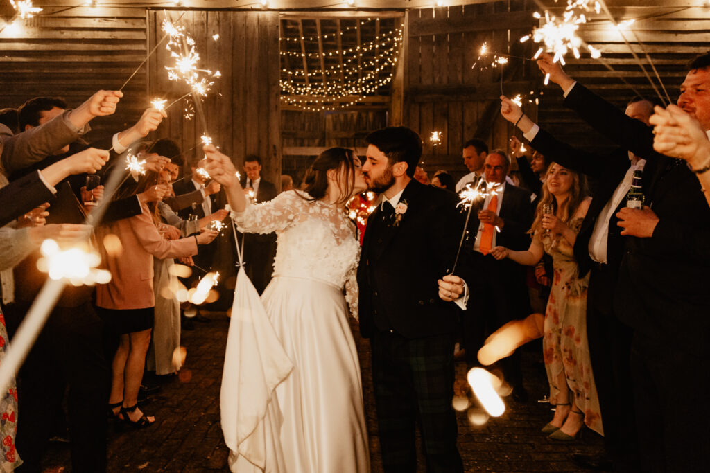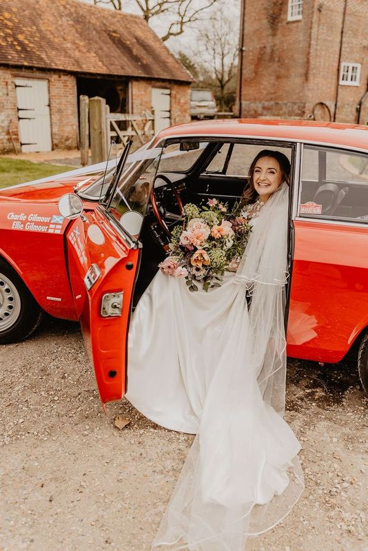 Starting the day in style, Ellie flew into the farmyard at top speed in a shiny red car, they were married in the barn with milk churns spilling over with lovely armfuls hawthorn blossom, blush roses, ranunculus, tulips, fritillaria, clematis and ammi.